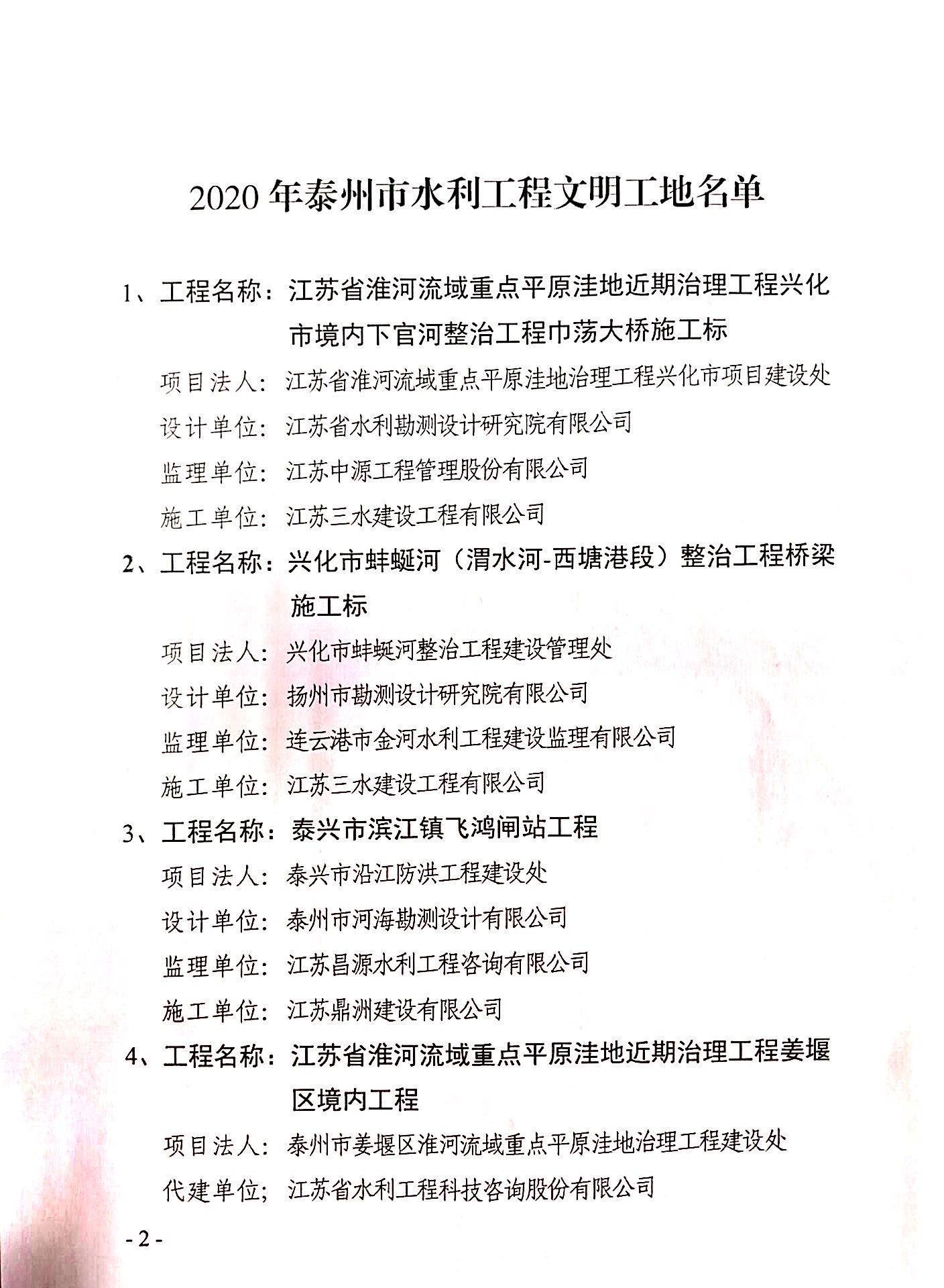 2020年泰州市水利工程文明工地(飛鴻閘站工程)