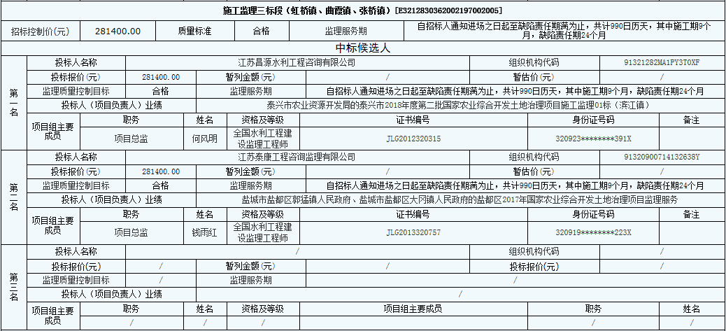 公司中標泰興市2019年高標準農田建設項目的施工監理三標段(虹橋鎮、曲霞鎮、張橋鎮)