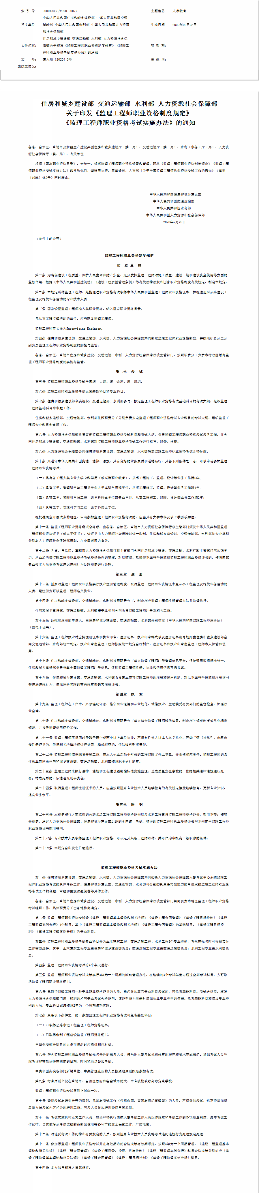 轉:住房和城鄉建設部、交通運輸部、水利部、人力資源社會保障部關于印發《監理工程師職業資格制度規定》、《監理工程師職業資格考試實施辦法》的通知