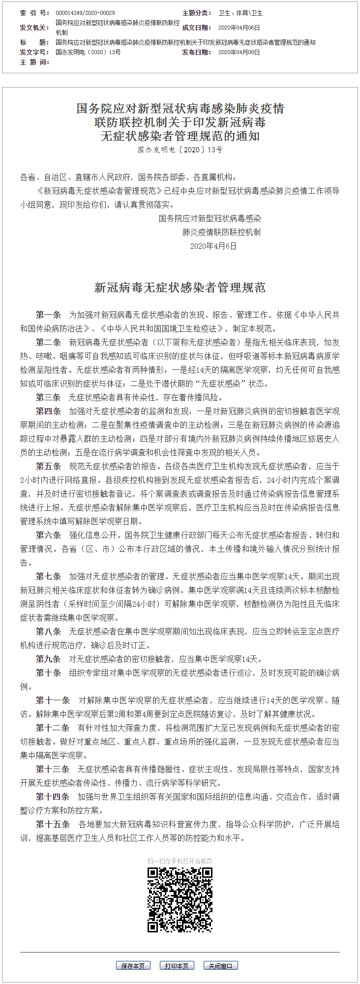 國務院應對新型冠狀病毒感染肺炎疫情聯防聯控機制關于印發新冠病毒無癥狀感染者管理規范的通知