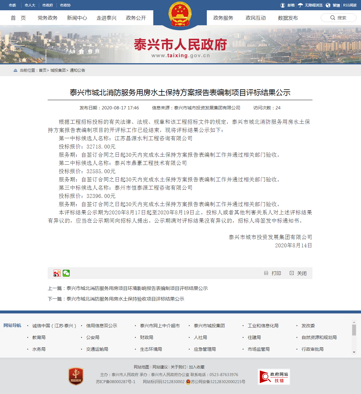 公司中標泰興市城北消防服務用房水土保持方案報告表編制項目